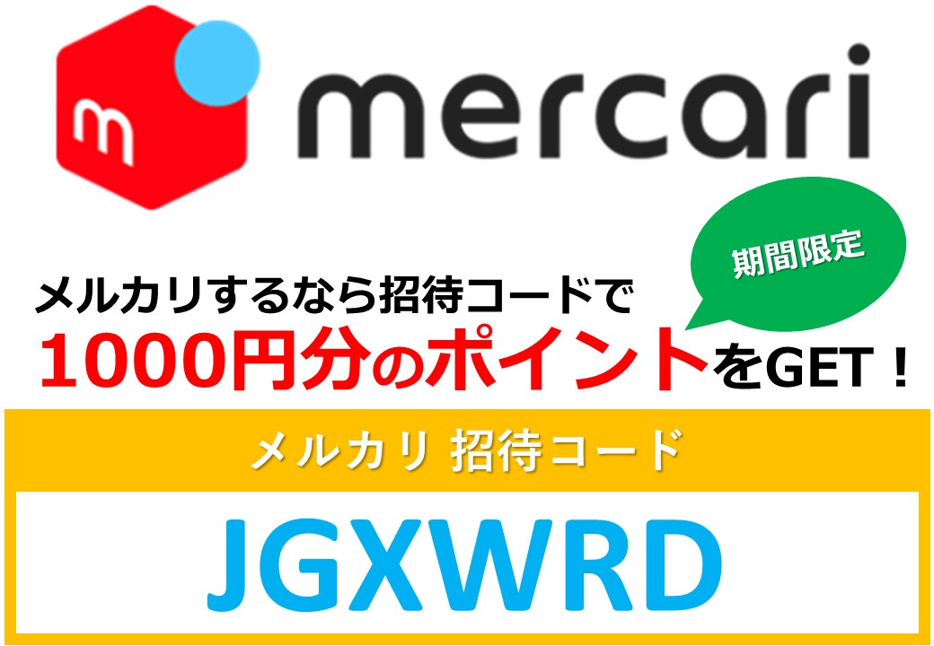 メルカリを新規で登録するときに、当ページ記載の招待コード:JGXWRD を入力するだけで、お買い物に使える500円分のポイントをGETできます!(友達招待プログラム)